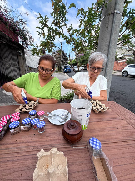 Huéspedes del Eco Hotel Árbol de Fuego participan en un huerto urbano en El Salvador, disfrutando una experiencia de turismo sostenible con actividades ecológicas en Antiguo Cuscatlán y conexión directa con la comunidad.